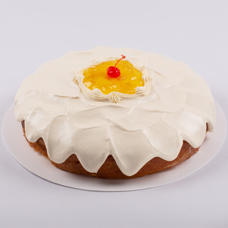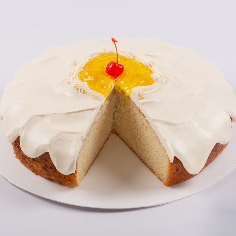 Tradicional pastel de piña chorreado con nuestro delicioso betún de limón decorado con un poco de mermelada de piña y una cereza. ¡El favorito de todos!