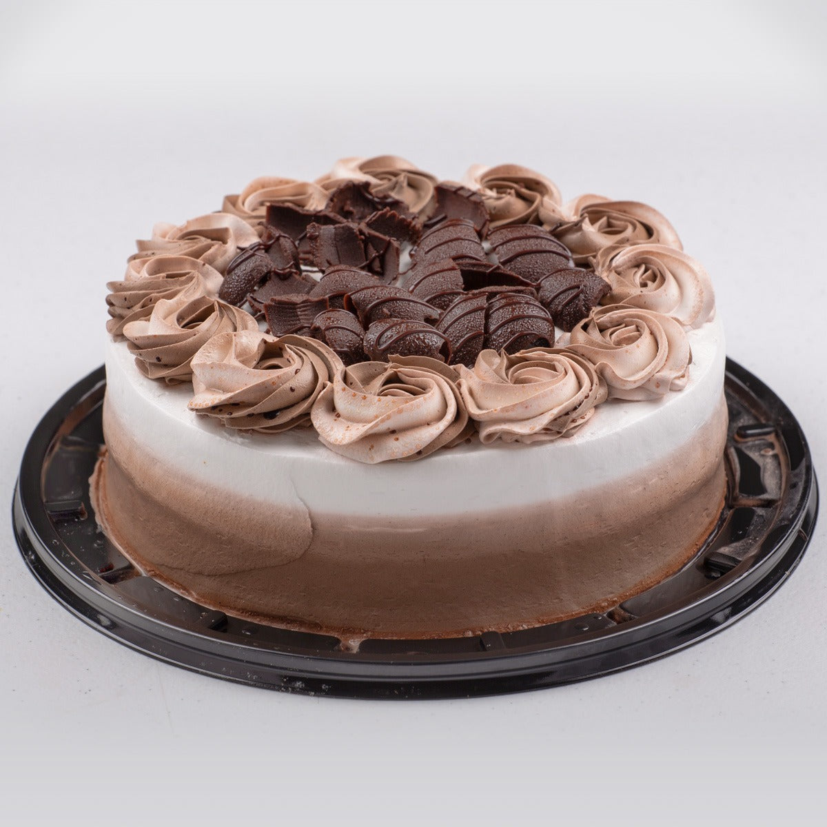 Pastel espiral de chocolate con un relleno de fresa que contrasta perfectamente con cada bocado. Decorado con generosos trozos de chocolate que añaden textura cada rebanada.